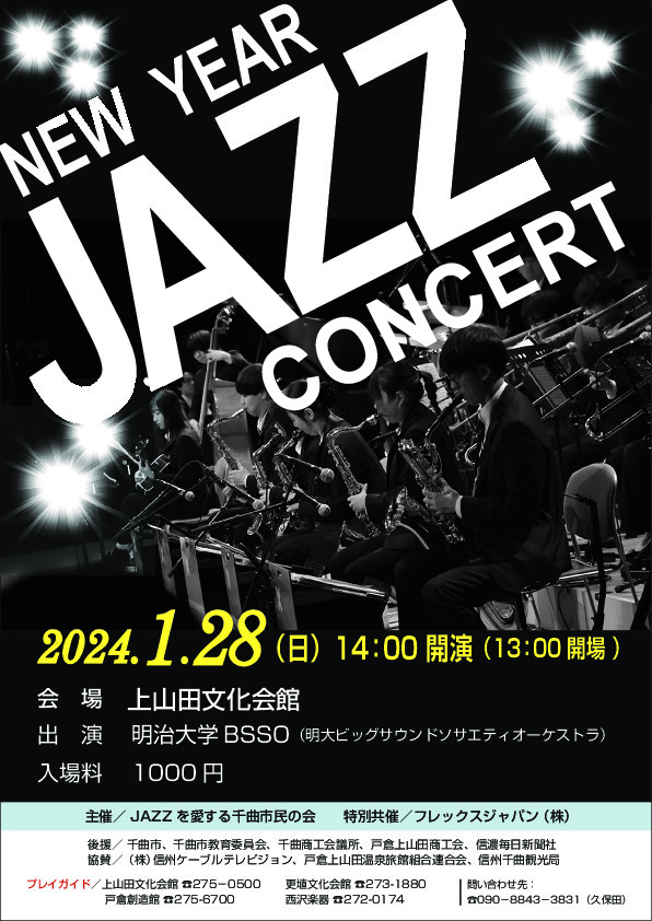 2024年1月28日(日)、上山田文化会館で明治大学BSSO ( Big Sounds Society Orchestra )による「NEW YEAR JAZZ CONSERT」を開催しました。